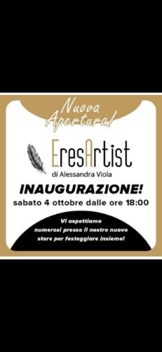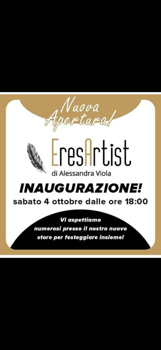 E’ con grande piacere comunicare agli amici e alle amiche che Sabato 4 Ottobre 2025 alle ore 18.00 in Via Traiano 17 a Benevento, verrà inaugurato il nuovo negozio, la nuova bottega di arte, bellezza e creatività, denominata Eres Artist, di Alessandra Viola un’artigiana campana, mamma, moglie e amante del proprio mestiere, come riportato dalla giovane titolare sul suo sito https://eresartist.com/ e sui suoi canali social facebook https://www.facebook.com/EresArtistgioielliartigianali ed instagram https://www.instagram.com/alessandra.viola.925/