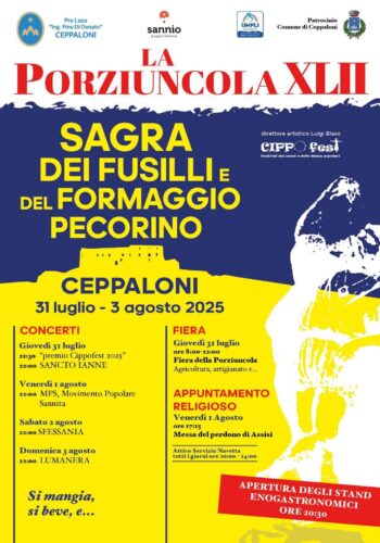 Dal 31 luglio al 3 agosto 2025, Ceppaloni ospiterà la 42ª edizione della Porziuncola, la tradizionale Sagra dei Fusilli e del Formaggio Pecorino, un evento che unisce sapori autentici, musica popolare e momenti religiosi.