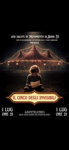 Martedì 1 Luglio 2025 dalle ore 21.00 presso l’Anfiteatro di San Giovanni di Ceppaloni, l’Associazione Sportiva Dilettantistica “Salute in Movimento” di Sara Zollo, con sede in Via Piano Alfieri di San Leucio del Sannio, dopo lo strepitoso successo dello scorso anno con “Qui il futuro è passato” presenterà il suo spettacolo dal titolo “Il Circo degli Invisibili”, in collaborazione con Vittorio Zollo e Ylenia Varricchio.