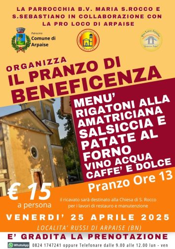 La Parrocchia B.V. Maria S. Rocco e S. Sebastiano, in collaborazione con la Pro Loco di Arpaise, con il patrocinio del Comune di Arpaise, organizza il Pranzo di Beneficenza, un evento solidale finalizzato a raccogliere fondi per i lavori di restauro e manutenzione della Chiesa di San Rocco.