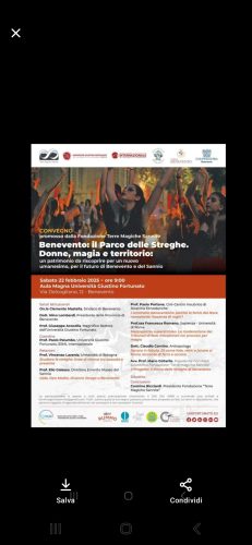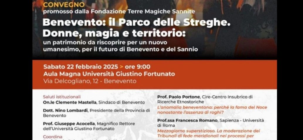 La Fondazione “Terre Magiche Sannite” promuove un importante convegno dal titolo “Benevento: il Parco delle Streghe. Donne, magia e territorio: un patrimonio da riscoprire per un nuovo umanesimo, per il futuro di Benevento e del Sannio”.