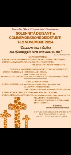 Pietrastornina celebrerà la Solennità dei Santi e la Commemorazione dei Defunti, in programma le Celebrazioni della Parrocchia